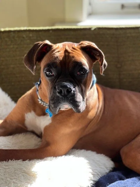 Rufus du Boxer came into Kat’s life via a TDC’s client and PUPstomer in 2022. She was fostering him via One More Dog Rescue and knew Kat loved boxers and he was found by CACC around 2 years old. It was love at 1st sight and Kat became a #badassboxermom of 3 boxers (Stanley Pup, Nella and Rufus)